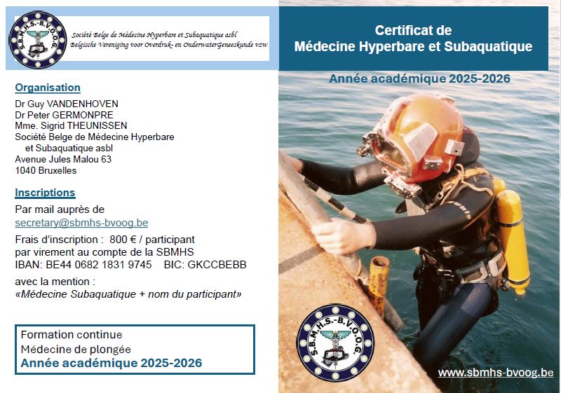 Certificat de Médecine Hyperbare et Subaquatique (Niveau I ECHM-EDTC): La SBMHS organise un nouveau Cours "Medical Examiner of Divers" (Niveau I ECHM/EDTC). Ce cours, destiné aux médecins (généralistes ou spécialistes) effectuant des examens d'apititude, médecins de travail, et tout médecin intéressé à connaître mieux la physiologie/pâthologie/aptitude à la plongée sous-marine. Huit